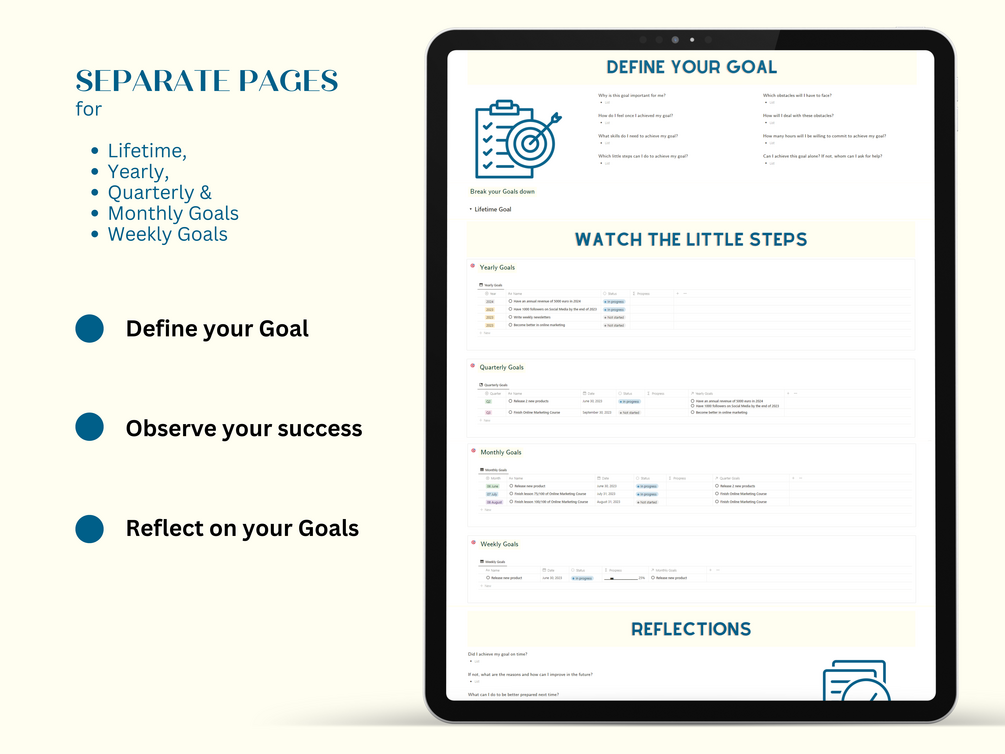 With "AchieveNow," access a comprehensive goal-setting system designed to turn dreams into realities. This Notion template serves as your personalized success roadmap, offering a structure that keeps you on track and inspired.